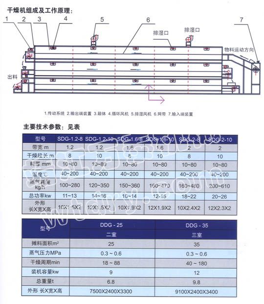 物料由加料器均勻地鋪在網(wǎng)帶上,網(wǎng)帶采用12-60目不銹鋼絲網(wǎng)。由傳動(dòng)裝置拖動(dòng)在干燥機(jī)內(nèi)移動(dòng)。干燥機(jī)由若干單元組成,每一單元熱風(fēng)獨(dú)立循環(huán),部分尾氣由專門排濕風(fēng)機(jī)排出,廢氣由調(diào)節(jié)閥控制,熱氣由下往上或由上往下穿過(guò)鋪在網(wǎng)帶上的物料,加熱干燥并帶走水分。網(wǎng)帶緩慢移動(dòng),運(yùn)行速度可根據(jù)物料溫度自由調(diào)節(jié),干燥后的成品連續(xù)落入收料器中。上下循環(huán)單元根據(jù)用戶需要可靈活配備,單元數(shù)量可根據(jù)需要選取。